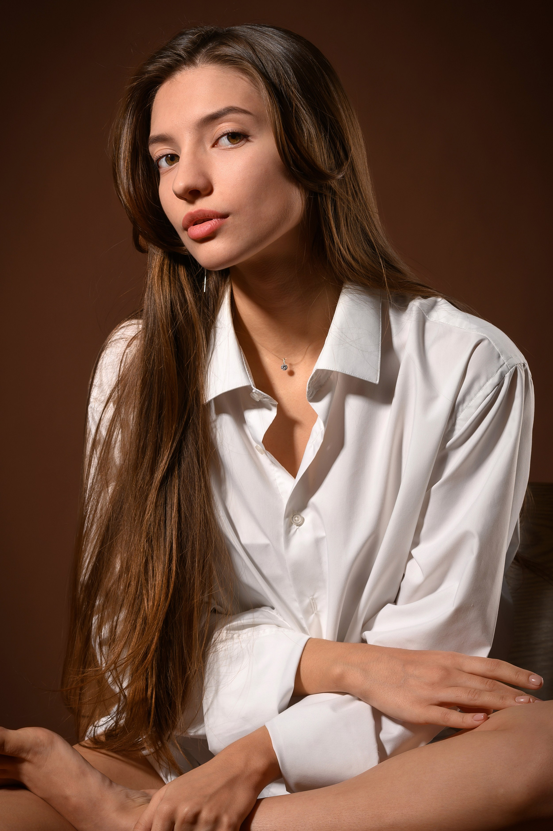 Небольшая серия студийных снимков с начинающей моделью Аделиной. Великолепные, запоминающиеся черты лица позволяют обойтись без сложных образов в одежде и сосредоточиться непосредственно на внешности девушки. В качестве фона для фото выбран однородный теплый оттенок, отлично сочетающий с тоном кожи, волосами и глазами Аделины.
